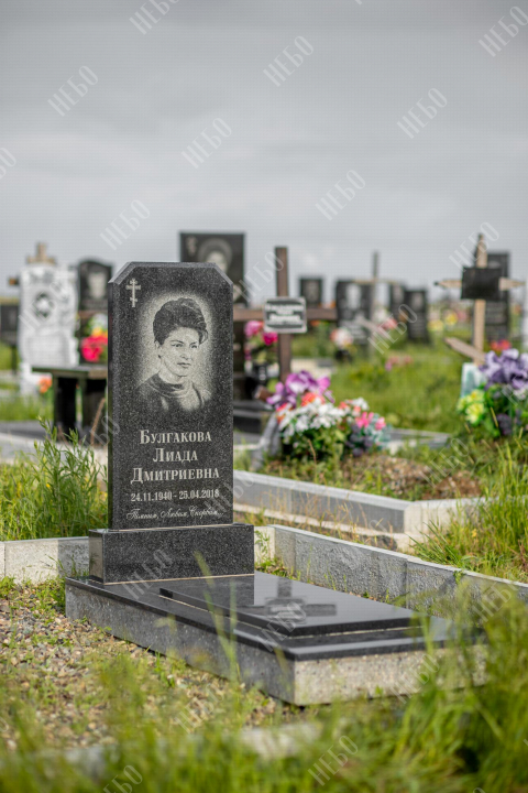 Христианский памятник с вертикальной стелой и закрытым надгробием выполнен в классическом черном цвете. Гранитная стела ритуального изделия имеет скошенные углы и дополнительно фигурно обработанные края по контуру. Такое исполнение придает внешнему виду памятника сдержанный, но в то же время оригинальный вид. Размер и форма памятника проработаны экспертами с учетом нагрузки и эстетического восприятия ритуального изделия. Закрытое  надгробие практично в уходе и при желании позволяет расположить на нем эпитафию.