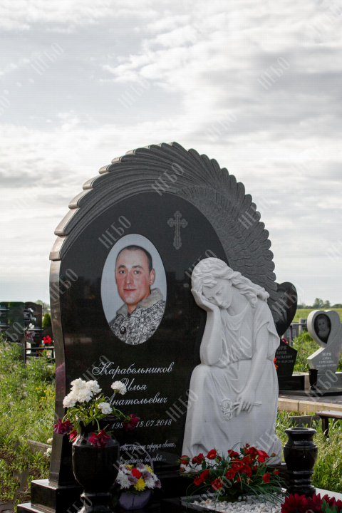Памятник фрезерный с фигурой ангела и открытым надгробием. Использование фрезеровки в изготовлении ритуальных изделий гарантирует высочайшую точность исполнения запланированного дизайна. С помощью этой технологии в камне высекаются углубления по заданным макетам, придавая памятнику объем, позволяя комбинировать различные элементы и создавать сложные фигуры. На фрезерованном памятнике удачно контрастируют цвета и в солнечную погоду играют тени от объемных деталей. Размеры стелы и надгробия соответствуют заданным нормам при имеющейся нагрузке и исключают деформации изделия со временем.