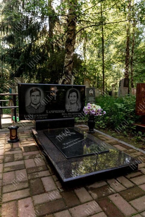 Горизонтальный семейный памятник с вазой , лампадой и закрытым надгробием. Невысокая надгробная стела прямоугольной формы содержит фото, информацию об усопших и изображение креста. Она отлично сочетается с закрытым гранитным надгробием. Такое решение является практичным и значительно упрощает уход за ритуальным изделием. Размеры памятника тщательно проработаны специалистами, что гарантирует конструкции долговечность и надежность.